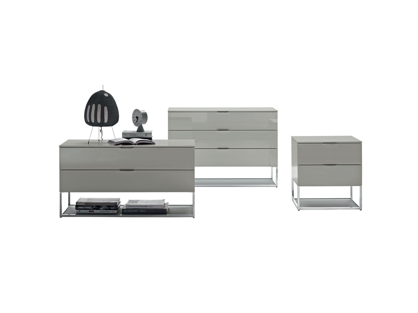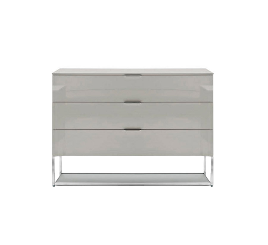 Sistema flessibile di mobili a cassetti con apertura a pressione o con maniglia che si completa con un elegante vano a giorno in alluminio lucido con vetro acidato protetto; particolare la versione dotata di un raffinato vano a giorno con illuminazione indipendente e una struttura in alluminio a sostegno delle cassettiere. Grande cura nella realizzazione delle finiture esterne laccate opache o a poro aperto in tutti i colori.