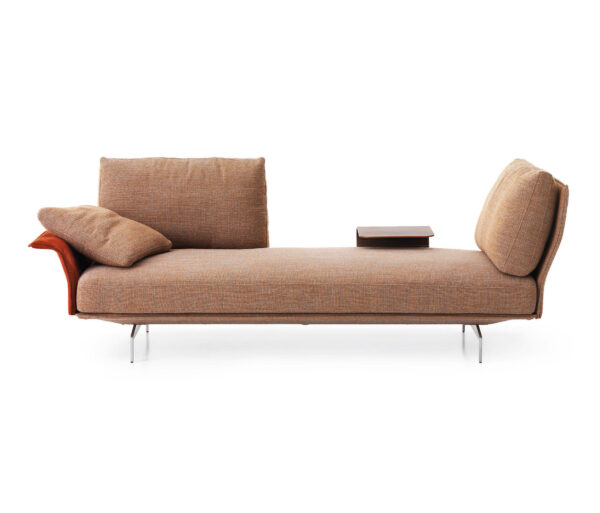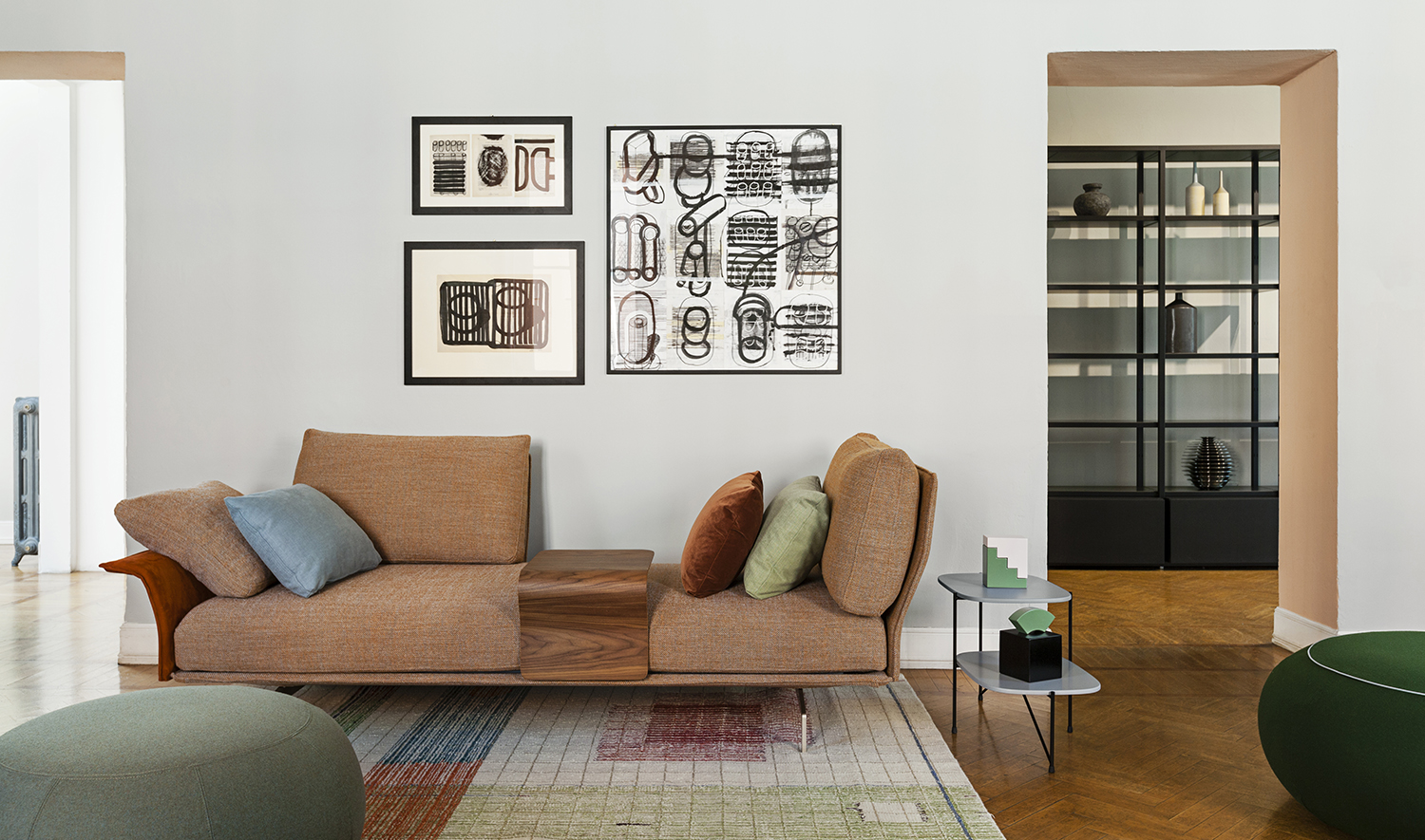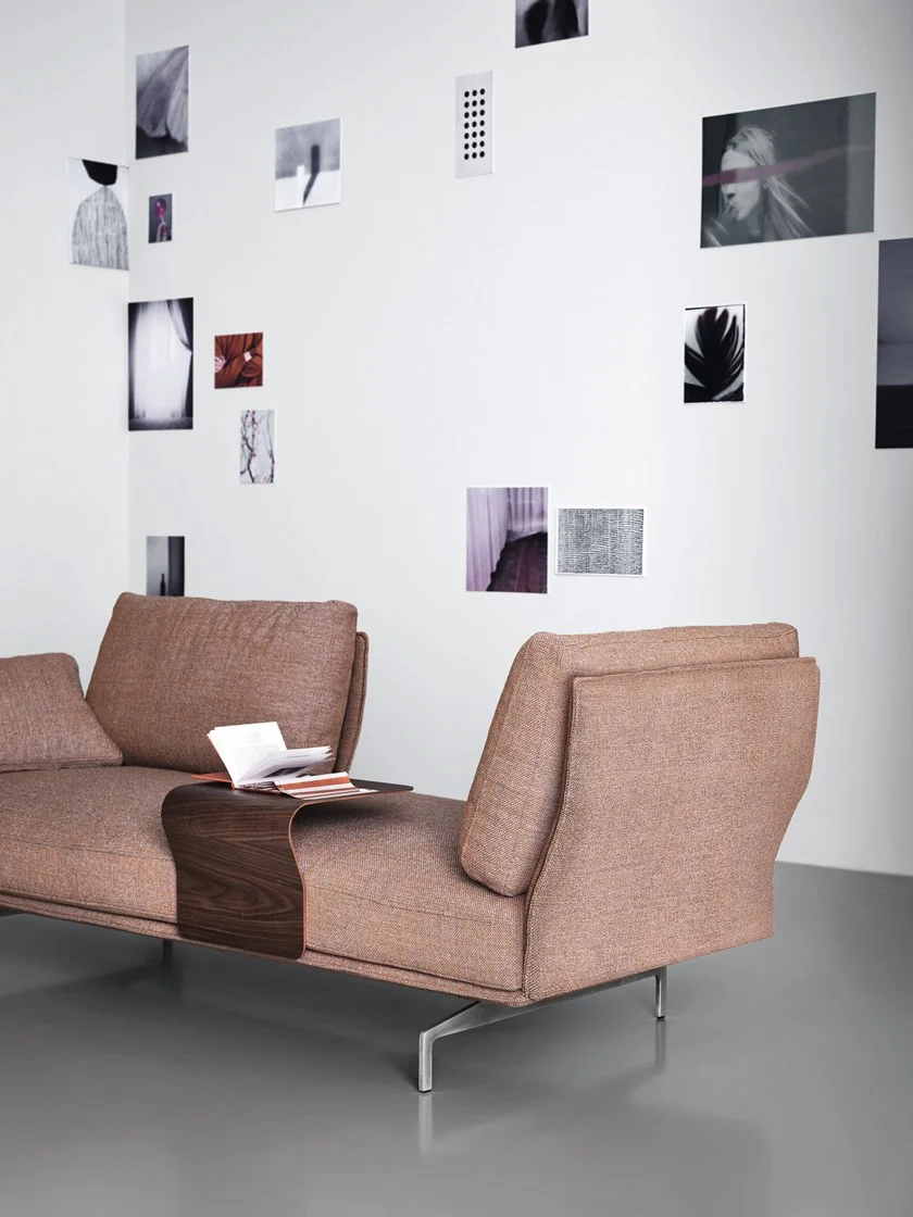 Raffinati accessori completano il sistema: i tavolini d’appoggio in due diverse dimensioni sono realizzati in legno noce canaletto. Completamente sfoderabile.