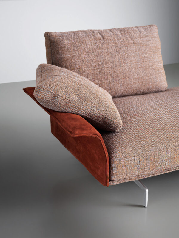 Rigoroso eppure leggero, il divano assume configurazioni estremamente interessanti grazie al particolare e unico sistema bracciolo/schienale che si stacca con un gesto semplice e si può posizionare lungo tutto il perimetro della base, le sedute sono appoggiate su una base di metallo rivestito in tessuto o in pelle, sollevato da terra su piedi in metallo.