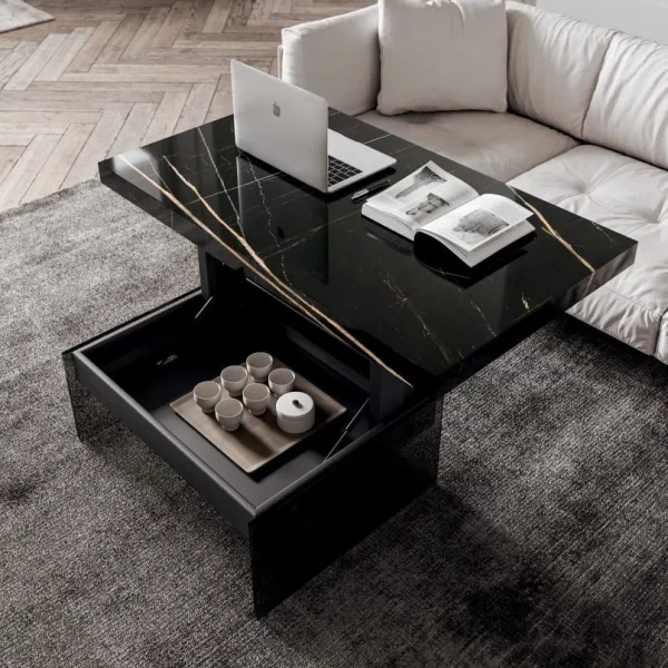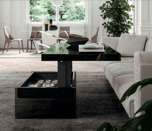 Tavolino trasformabile a 2 altezze, struttura in marble glass, gambe in cristallo e meccanismo di sollevamento a gas auto-frenante.