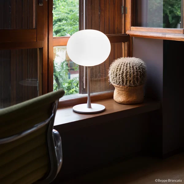 Glo-Ball Table 1 di Flos è la lampada da tavolo a luce diffusa ideata da Jasper Morrison nel 1998 e fa parte dell’omonima collezione che comprende anche versioni da terra e a sospensione. Il diffusore in vetro opalino bianco, acidato e soffiato a bocca consente di ottenere la massima diffusione della luce.