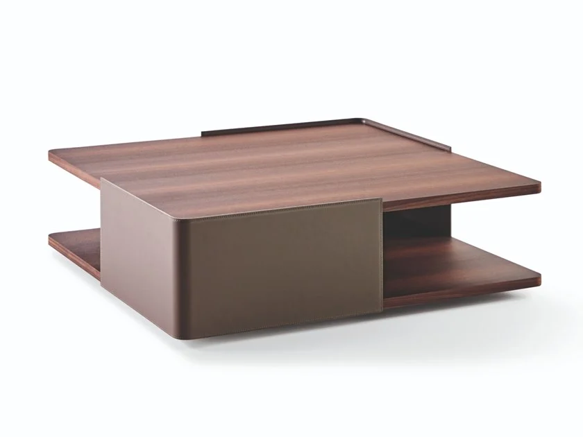 Di forma quadrata o rettangolare sono tavolini dotati di due piani orizzontali in essenza, sostenuti da elementi verticali curvi sempre rivestiti in cuoio, che vanno a formare un vano parzialmente chiuso tra i due piani atto a contenere ogni tipo di oggetto che si ama tenere a portata di mano quando ci si accomoda sul divano.