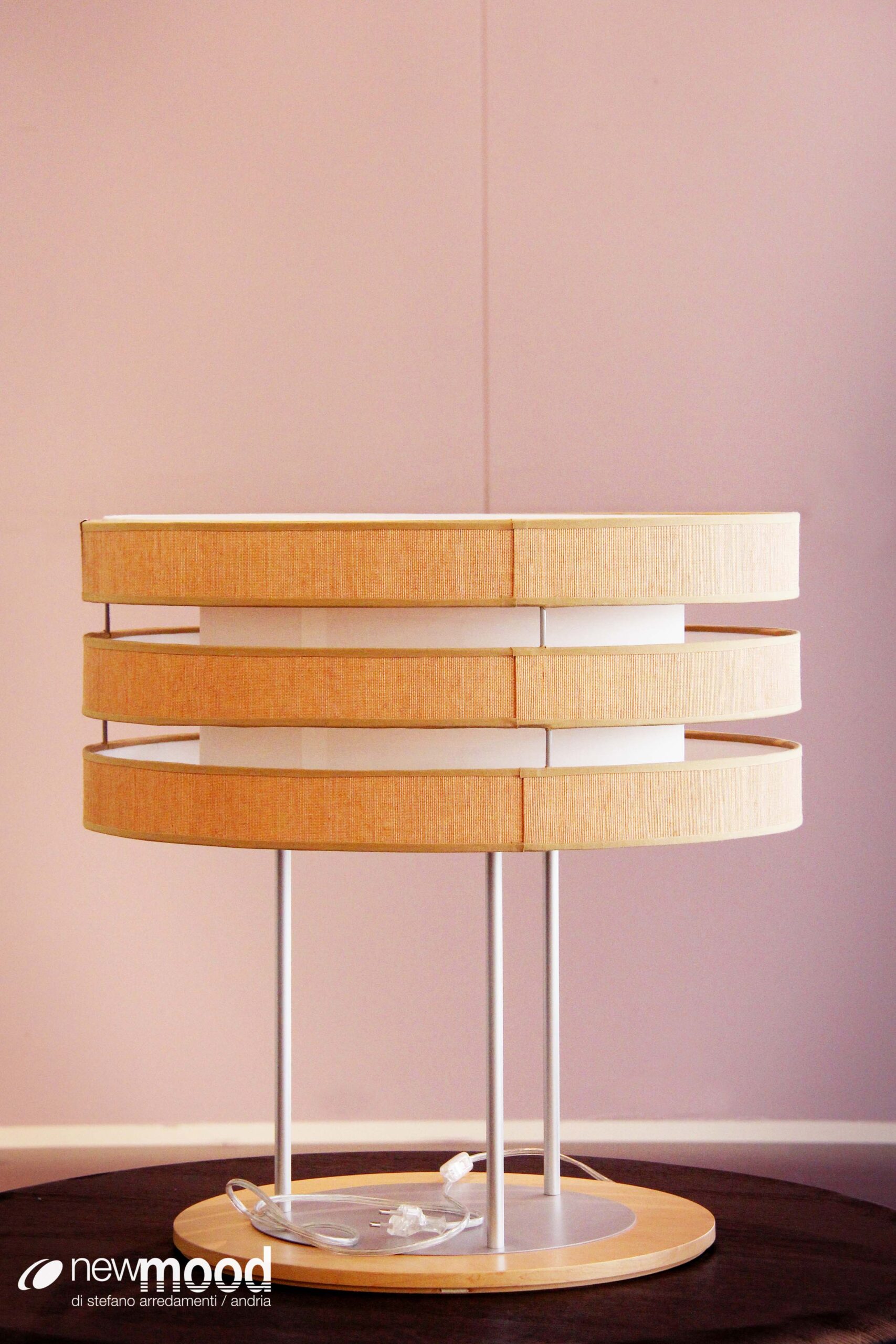 Lampada da tavolo Giorgetti mod. Planet , base in legno multistrato, impiallacciatura in acero 28 lucidato naturale con piastra e steli in metallo verniciato grigio metallizzato, paralume in metallo verniciato e tessuto. Dim. d56 x h56
