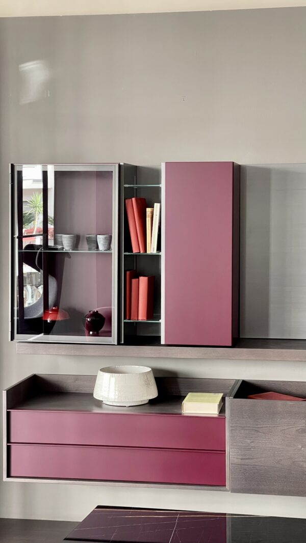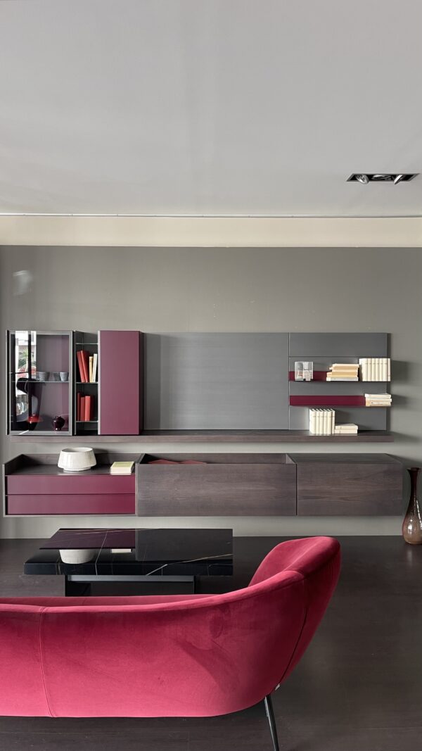 parete skyline , in olmo colorazione opaco, grigio antracite, vetro trasparente, e aperture con teca 1 e led