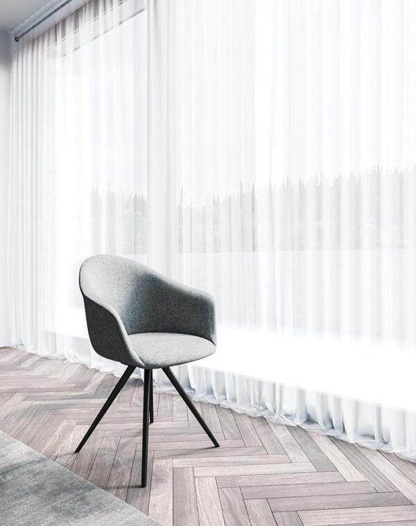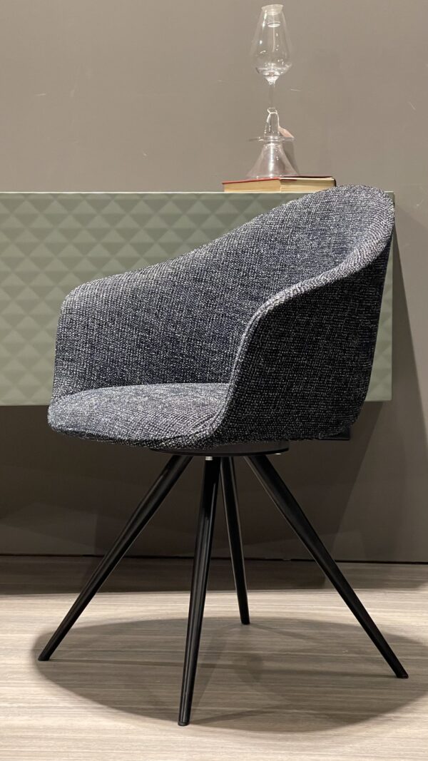 Una poltrona un po’ sedia, con seduta, braccioli e schienale in poliuretano espanso, rivestiti da un’imbottitura di gomma e ricoperti di tessuto. Le gambe sono realizzate in metallo o legno.